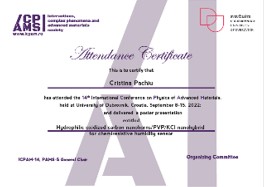 - Bogdan-Catalin Șerban, Octavian Buiu, Nicolae Dumbrăvescu, Viorel Avramescu, Mihai Brezeanu, Maria-Roxana Marinescu, Marius Bumbac, Cristina Nicolescu, Hydrophilic oxidized carbon nanohorns/PVP/KCl nanohybrid for chemiresistive humidity sensor, 14th International Conference on Physics of Advanced Materials (ICPAM-14), September 8 – 15, 2022, in Dubrovnik, Croatia.