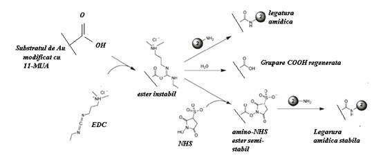 - Gruparile terminale COOH se activeaza folosind o solutie realizata in tampon fosfat (pH=7) cu urmatoarea compozitie: 0.002 M hidroclorura de 1-etil-3-[3-dimetilaminopropil]carbodiimida (EDC), 0.005 M N-hidroxisulfosuccinimida (Sulfo-NHS) si colagen(pH=5, 5μl). In scopul legarii ireversibile a moleculei de colagen pe substratul functionalizat, reactia a avut loc la temperatura de 40C timp de 12h, la intuneric. Molecula de EDC reactineaza cu gruparea carboxil terminala de pe suprafata de aur si formeaza un intemediar instabil, care, daca nu intalneste o amina va regenera gruparea carboxilica. In prezenta de (Sulfo-NHS), se formeaza un amino-NHS ester care va fi susceptibil la atacul nucleofil al gruparilor amino- din molecula de colagen.