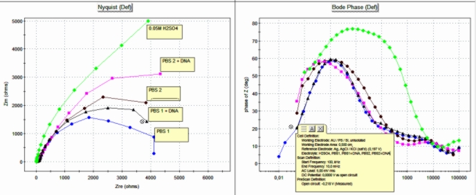 - DNA hybridisation on electrodes analysis for development of DNA chips since it is a non-invasive technique (the applied AC excitation is small enough to prevent the unwanted effects on biomaterials and does not requires a potential ramp to determine the irreversible oxidation of biomolecules linked to the surface) – applications in detecting of protein binding to a nucleic acid layer;