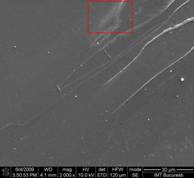 SEM image of the Si surface irradiated with high-power UV pulses. The red rectangle is the region augmented in the central and left figures, respectively. The Si wires have less than 130 nm diameter, are curved and form bundles.Their lengths are between 10 microns and several tens of microns.The bar scale in the right image is of 400 nm. SEM image by courtesy of Adrian Dinescu, IMT-Bucharest.