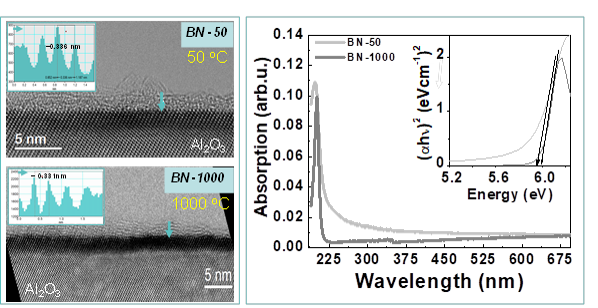 In a collaborative work involving research groups from Romania, Spain and Germany it has been recently shown that high-quality ultrathin sp2-BN material can be grown on sapphire substrates not only at the high temperature of 1000 oC (BN-1000) but also at the much lower temperature of 50 oC (BN-50) by molecular beam epitaxy. By our knowledge, This is, so far, the lowest temperature ever used for the synthesis of sp2-BN materials by a growth technique. The next step is to develop BN/AlN_on_Si templates by growing thin layers of sp2-BN on top of AlN_on_Si substrates.