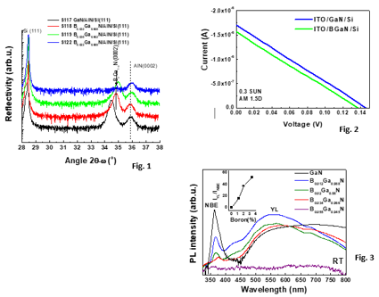Thus, using an advanced growth technique, namely, molecular beam epitaxy (MBE), ternary compunds BGaN/AlN/Si(111) have been grown by MBE, as seen in Fig (1). Incorporating next the sintesized material in a solar cell structure on Si(111) has been seen to be accompanied by an undesired drop in shortcircuit current and opencircuit voltage comparing to a reference GaN-on-Si(111), as depicted in Fig. 2. While reduction of the photovoltage could be associated to the decrease in the bandgap of the BGaN compared to GaN, the decrease in the generated photocurrent suggests that despite strain compensation with respect to AlN/Si the presence of B leads unavoidable deterioration of the host semiconductor matrix. Indeed, such B-induced deterioration has been found to start even at low boron concentrations, as demonstrated experimentally (see Fig. 3).