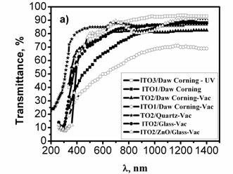 The transmitance, reflectance and refractive index of TCO thin layers deposited on different substrates as a function of wavelength.
