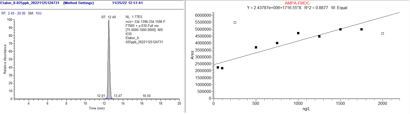 The development process of a UHPLC-MS/MS method for the quantification of GLY, AMPA and GLU in water samples was also started. After optimizing the amount of derivatization reagents (Figure 2), so that calibration performance can be achieved, the limit of detection (LD), limit of quantification (LQ) and percent recovery will be estimated for each individual analyte.