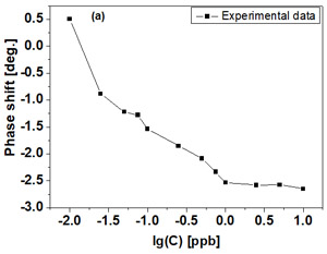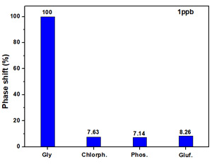 The detection of Gly in real samples (collected from the area of the Drăgășani dam - Olt River) was carried out at concentrations in the range of 0.01-50 ppb. The response of the MIP-SAW sensor to these concentrations is illustrated in Figure 1.a. A linear range in the 0.025-1 ppb concentration range was observed for the MIP-SAW sensor tested in real samples, and the obtained sensitivity was approx. 0.99 deg./ppb. Chlorpyrifos, phosmet, and glufosinate were used as interferents in carrying out the selectivity tests. In Figure 1.b the MIP-SAW sensor shows a high value of the phase shift in the presence of Gly for the concentration of 1 ppb compared to the value obtained for the other interfering species, demonstrating the high selectivity of the developed sensors.
