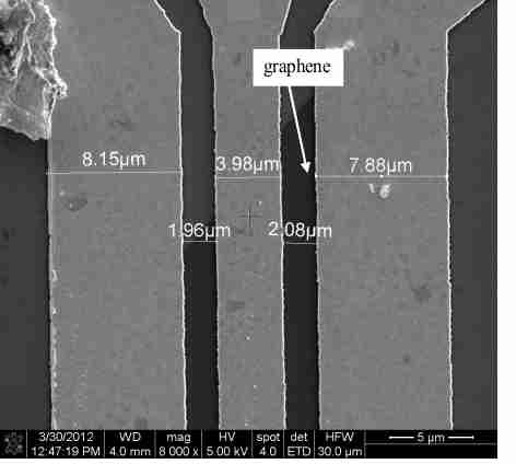 In 2012 , the project was focused for the design ,smulation and fabrication of a coplanar waveguide on graphene (see SEM photo below)