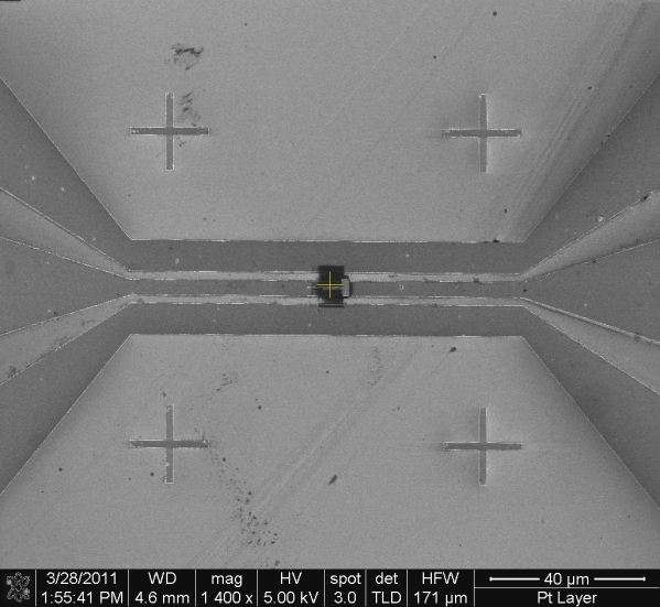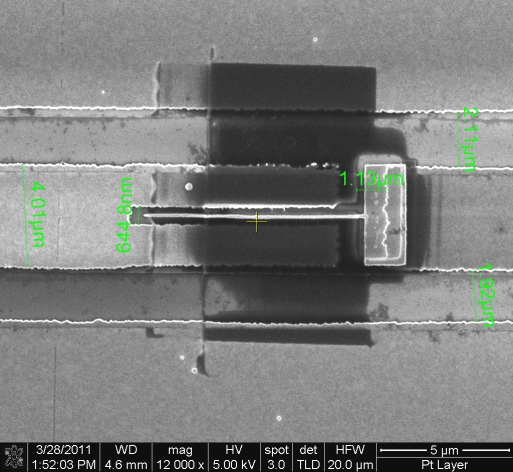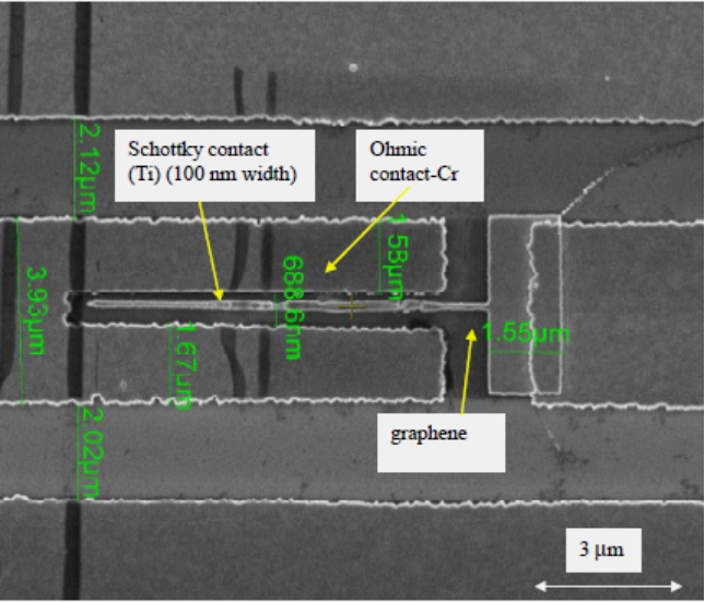 Dimensiunile diodei Schottky pe grafena se observa din imagina SEM a diodei care a fost fabricata pe baza principiilor de mai sus (Fig.2).