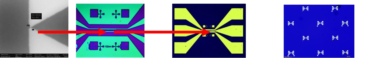 O alta dioda fabricata este o dioda balistica pe grafena (Fig.4), cu dimensiuni mult mai mici decat cea de mai sus. Fabricarea este bazata tot pe litografie e-beam. Acesta functioneaza pe urmatoarul principu: prin geometria ei neuniforma care seamana cu o palnie exista toatedauna o plaja de tensiuni unde curentul este zero Latura mare a diodei din Fig. 4° are 100 nm si cea mica 30 nm adica este formata di aproximativ 120 de atomi de carbon.