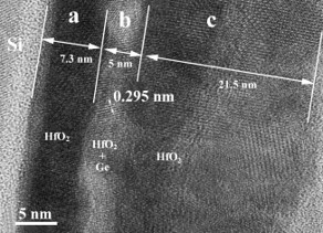 In Fig.1 we see the HRTEM structure of of 3 layers stack: HfO2 orthorhombic/tetragonal phase (0.295 nm lattice fringe) in the intermediate layer (HfO2 + Ge).