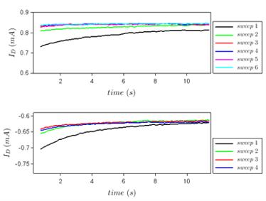 In Fig.12 the drain current dependence in time for a drain voltage of +2 V (top) and -2 V (bottom).We see that the conductance of the memtransistors is increasing/decreasing in time as in the case of the synapses.