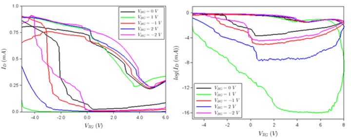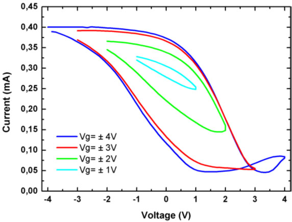 The transistor is acting as a memtransitor with a high on/off ratio. Both top and back gates are controlling the flow of carriers in the graphene channel even at small values, of few volts. The top gate is driving the transistor in on/off states with hysteretic behaviour while the backgate voltage controls the current flow/drain current in graphene, modulating the on/off ratio depending on its polarity, as in the case of a memristor. The transistor is a non-volatile memory since its versus positive drain voltage and versus top gate voltage for different backgate voltages (see Fig. 13) show a hysteretic behaviour.
