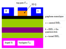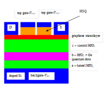 We have obtained experimental results regarding a FET with graphene monolayer channel transferred over the ferroelectric structure HfO2/Ge-HfO2 / HfO2, which behaves as a memtransistor-like structure and works at very low drain voltages compared with the above devices, i.e. in the range of -2 to +2 V, while the gate voltages are of few volts, the transistor being off at a gate voltage of 9 V. In this respect, we have combined two principles leading to synaptic transistors mentioned above, i.e. the ferroelectricity and floating gate in a single device. Since all memtransistors reported up to now are using flakes of MoS2, we have radically changed the materials and technologies in order to fabricate the devices at the wafer scale. We have chosen the configuration of 3-layers-stack consisting of control HfO2/Ge-HfO2 intermediate layer/tunnel HfO2/p-Si substrate with ferroelectric properties. This 3-layers-configuration has the advantage of obtaining orthorhombic HfO2 phase by employing both strain and doping induced by Ge and is deposited on 3x3 cm2 doped Si substrate, its top layer being covered with graphene monolayer transferred by Graphenea. The schematic cross-section of the memtransistor is depicted in Fig. 8. It is a FET having a top and a back gate, its graphene monolayer channel being isolated from the top gate electrode by HSQ (Hydrogen silsesquioxane). Tens of FETs were fabricated on the same wafer.