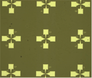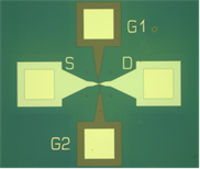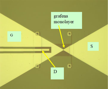 The second circuit was a microwave transistor where the gate is the hot electrode and massive source is the cold electrode (see for example [5]M.R.Gasper,R.C.Toonen, N.C.Varaljay, R.R. Romanofsky, F.A. Miranda, Thermoelectric graphene nanoconstrictions as detector of microwave signals, IEEE Trans. Nanotechnology 18, 879-884 (2019). In Fig. 3a we present the SEM image of this transistor having as channel graphene monolayer grown on HfZrO and in Fig. 3b , the optical image of this FET fabricated on a 4 inch scale.
