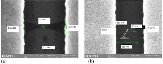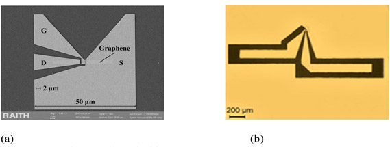 | Fig. 1 (a) SEM image of (a) graphene FET with bowtie channel shape (b) graphene FET with delta channel shape. |
