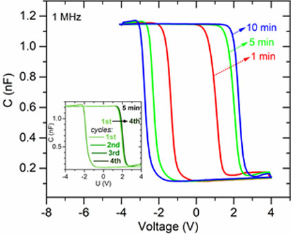Polarization, PFM and capacitance measurements were used to characterize this HfGeO ferroelectric. Below is presented the capacitance measurements where a large memory window is observed.