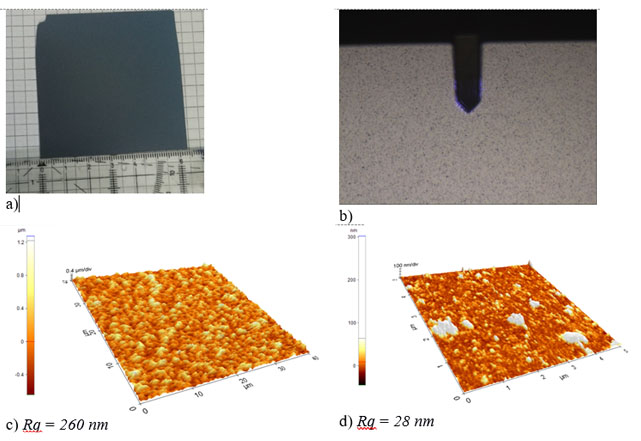 Imagini optice a) PZT wafer 6.5 x6.5 cm, b) surface of PZT (~ 480 μm x 360 μm) sAFM images 1 c) 40 µm × 40 µm, d) 5 µm × 5 µm