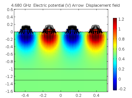 În cadrul acestei etape au fost dezvoltate modele numerice pentru simularea multifizică a rezonatoarelor SAW utilizând programul COMSOL Multiphysics. Cu ajutorul acestor modele au fost investigate distribuţiile câmpului electromecanic (potenţial electric şi deplasare) pentru diferite moduri de propagare (Fig. 1) în cazul unui strat de GaN de 1 µm grosime, crescut prin tehnica MOCVD pe un substrat de siliciu de înaltă rezistivitate. Au fost prezentate cazurile metalizărilor cu aur şi cu aluminiu.