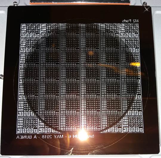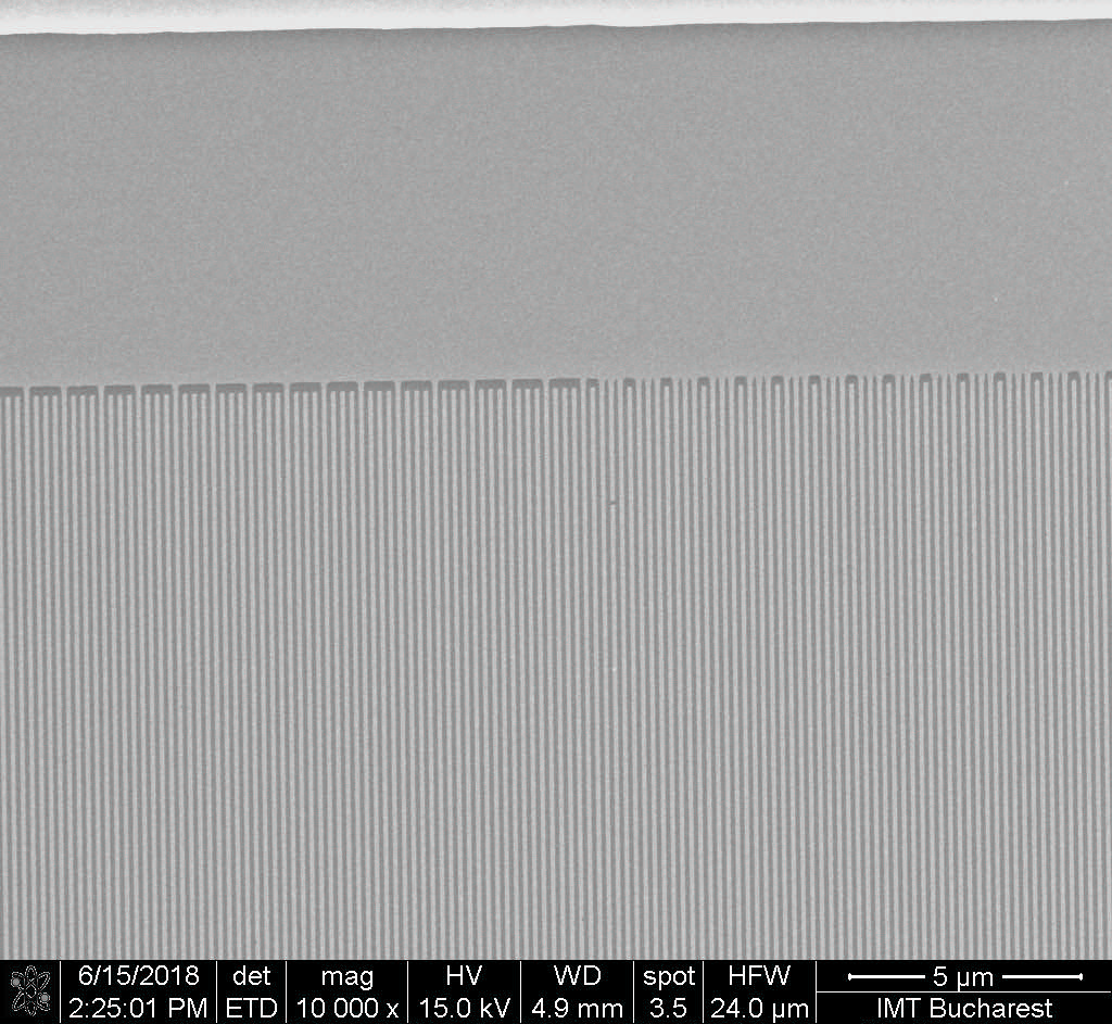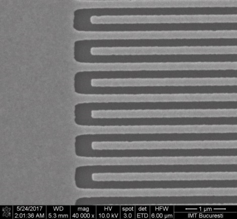 Pentru obţinerea de digiţi/interdigiţi de 100 nm, s-a optat pentru o grosime a stratului de metalizare de 5/45 nm Ti/Au. În acest caz procesul tehnologic a constat din 3 paşi principali: 1. Depunerea prin lift-off a semnelor de aliniere pentru nano-litografie şi pentru circuitele CPW; 2. Scrierea prin litografie cu rază de electroni a structurilor interdigitate şi depunerea prin lift-off a metalizării de 5/45 nm Ti/Au; 3. Depunerea prin lift-off a circuitelor CPW (5/300 nm Ti/Au). Pentru paşii 1 şi 3 s-au fabricat măşti dedicate de striclă cu trasee din crom (Fig. 10). Structurile de tip normal cu dimensiuni de digit/interdigit de 130 nm şi 150 nm au fost realizate cu metalizare de 5/95 nm Ti/Au şi, respectiv, 70 nm Al folosind procesul tehnologic descris în Etapa 1/2017.