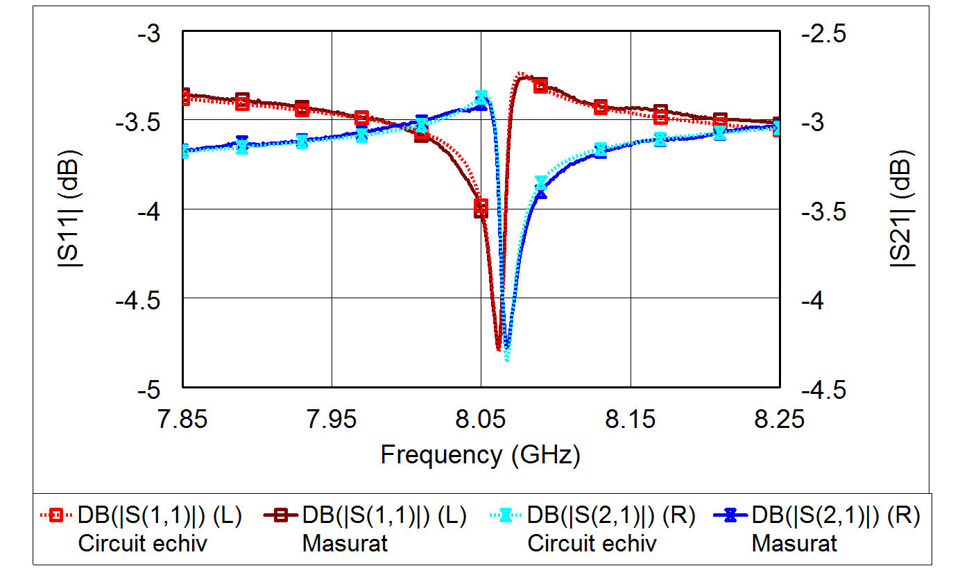 Caracterizarea în domeniul microundelor a fost realizată prin măsurători de parametri S pe plachetă (Fig. 6). Rezultatele au demonstrat acoperirea întregului spectru de frecvenţe de interes pentru filtrele trece bandă. Modelarea pe bază de circuit echivalent a presupus definirea de noi parametri de model: factorul de calitate, frecvenţa de rezonanţă serie şi coeficientul de cuplaj piezoelectric efectiv, pe lângă capacitatea statică.