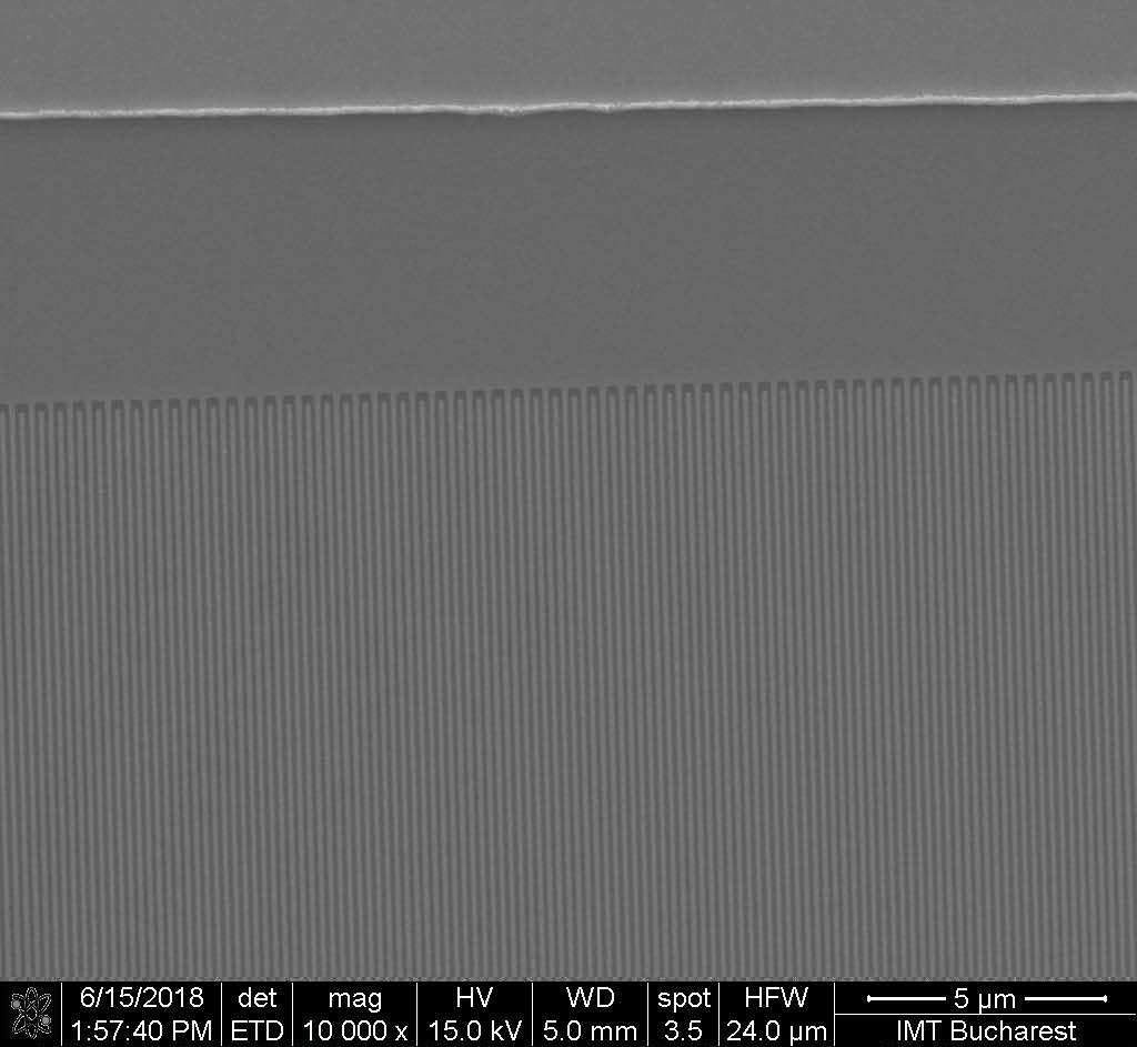 Au fost proiectate structuri de test şi măştile de procesare pentru Lot 1. Lotul 2 conţine blocuri componente ale filtrelor trece bandă. Structurile au fost fabricate, utilizând un flux tehnologic în trei etape, optimizat pentru a răspunde cerinţelor de metalizare subţire pentru rezonatoarele SAW şi metalizare groasă pentru realizarea padurilor de contactare, liniilor de transmisie CPW, inductoarelor printate cu constante concentrate. Structurile au fost caracterizate structural utilizând SEM (Fig. 3 si Fig. 4) şi AFM (Fig. 5) şi a fost demonstrată calitatea procesului tehnologic.