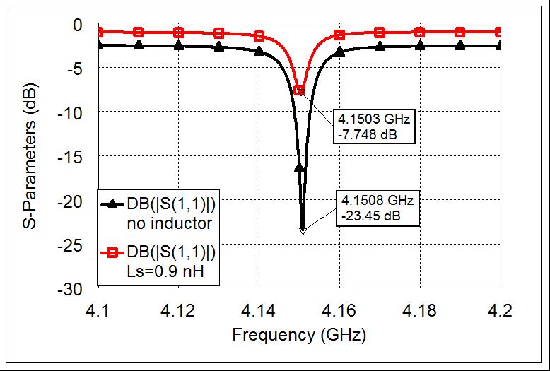 Fig. 11. Efectul modificării valorii inductorului meandru prin adăugarea în serie a Ls=0.9 nH |