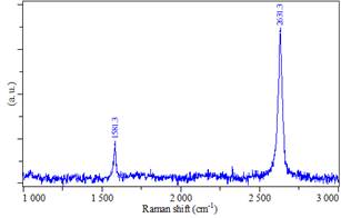 Spectru Raman: grafenă pe sybstrat de cupru. Picurile G și 2D, 1581 cm-1 și 2631 cm-1, precum și raportul I2D/IG > 2, confirmă prezența grafenei monostrat. |