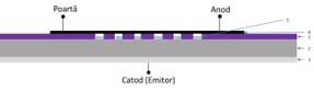 Desen schematic al senzorului de presiune cu emisie în câmp cu membrană din grafenă și emitori din siliciu nanostructurat: (1) Oxid de siliciu pentru izolarea anodului de catod; (2) Siliciu monocristalin puternic dopat; (3) Aluminiu pentru contactarea catodului; (4) Membrană de grafenă CVD transferată printr-o metodă chimică modificată; (5) Nanofire de siliciu cu rol de emitor.