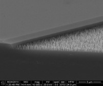 Imagine SEM: uprafata nanostructurata a plachetei de siliciu. Zona nestructurata este mascata cu oxid de siliciu. |