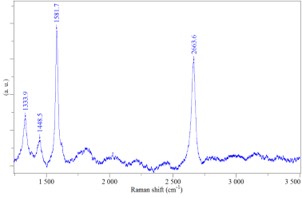 Spectru Raman: grafenă pe sybstrat de cupru. Picurile G și 2D, 1581 cm-1 și 2631 cm-1, precum și raportul I2D/IG > 2, confirmă prezența grafenei monostrat. |