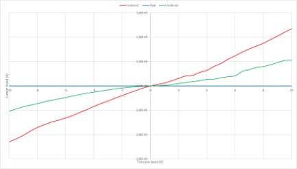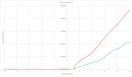 Caracteristica de emisie Fowler – Nordheim fără presiune aplicată pe poarta de grafenă (verde) și cu presiune 50 Pa aplicată pe poarta de grafenă (roșu) |