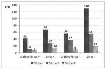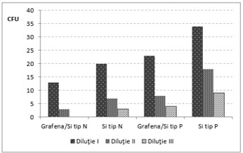 Din reprezentarea grafică a rezultatelor se poate observa o activitate antibacteriană superioară manifestată de monostratul de grafenă depus pe substrat de siliciu tip N comparativ cu substratul de siliciu tip P. Aceast efect a fost mult mai vizibil pentru concentraţia cea mai redusă a suspensiei bacteriene reincubate (diluţia III corespunzătoare densităţii 105 CFU/ml).