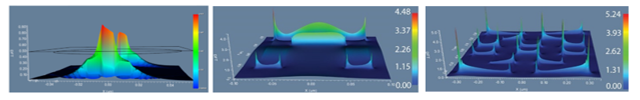 1. Extensive numerical analysis performed by three-dimensional (3D) simulations using the finite difference in time and space (FDTD) method to identify the optimal geometry, size and configuration of the nano-structures that constitute a plasmonic metasurface, focusing on achieving the highest resonance at various wavelengths (NIR-VIS), for local enhancement of the excitation field and collection efficiency of emitted photons. Three district configurations were investigated at 532 nm wavelengths excitation wavelength for Rhodamine 6G) and 552 nm (emission wavelength) respectively. The results offer localized electromagnetic filed enhancement of up to 6.25 folds.