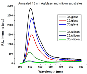 3. Fluorescence enhancement for Rhodamine 6G tests on fabricated structures. The tests were performed on 2 types of substrates (glass and silicon) using 3 distinct concentrations (50/10/5 µM) of dye dispersed in PMMA.