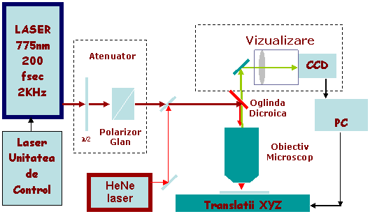 Dispozitivul de procesare laser este format din laser femtosecunde, atenuator variabil, optica de focalizare, translatii si sistem de vizualizare