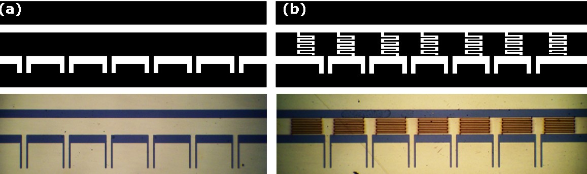 Structura CRLH realizata prin combinarea fotolitografiei si ablatiei laser. (a) Stuctura realizata prin fotolitografie; (b) Structura dupa procesare laser.