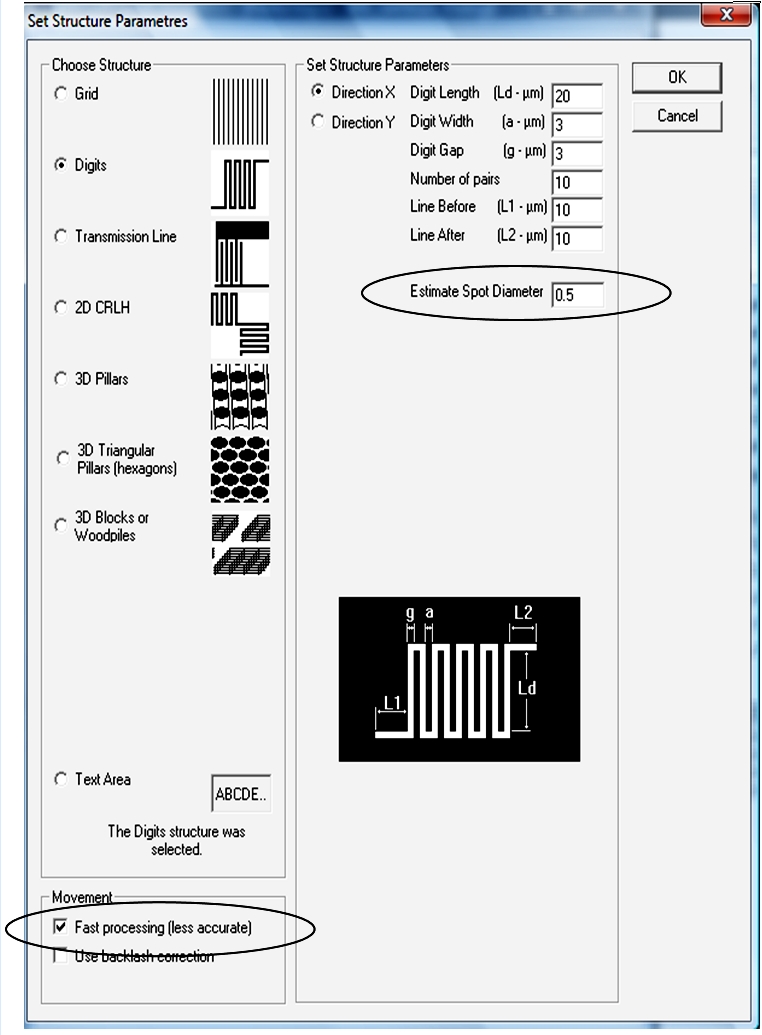 Interfata software permite alegerea altgoritmului dorit pentru realizarea structurii interdigitale (dati click pe poza pentru versiunea mai mare)