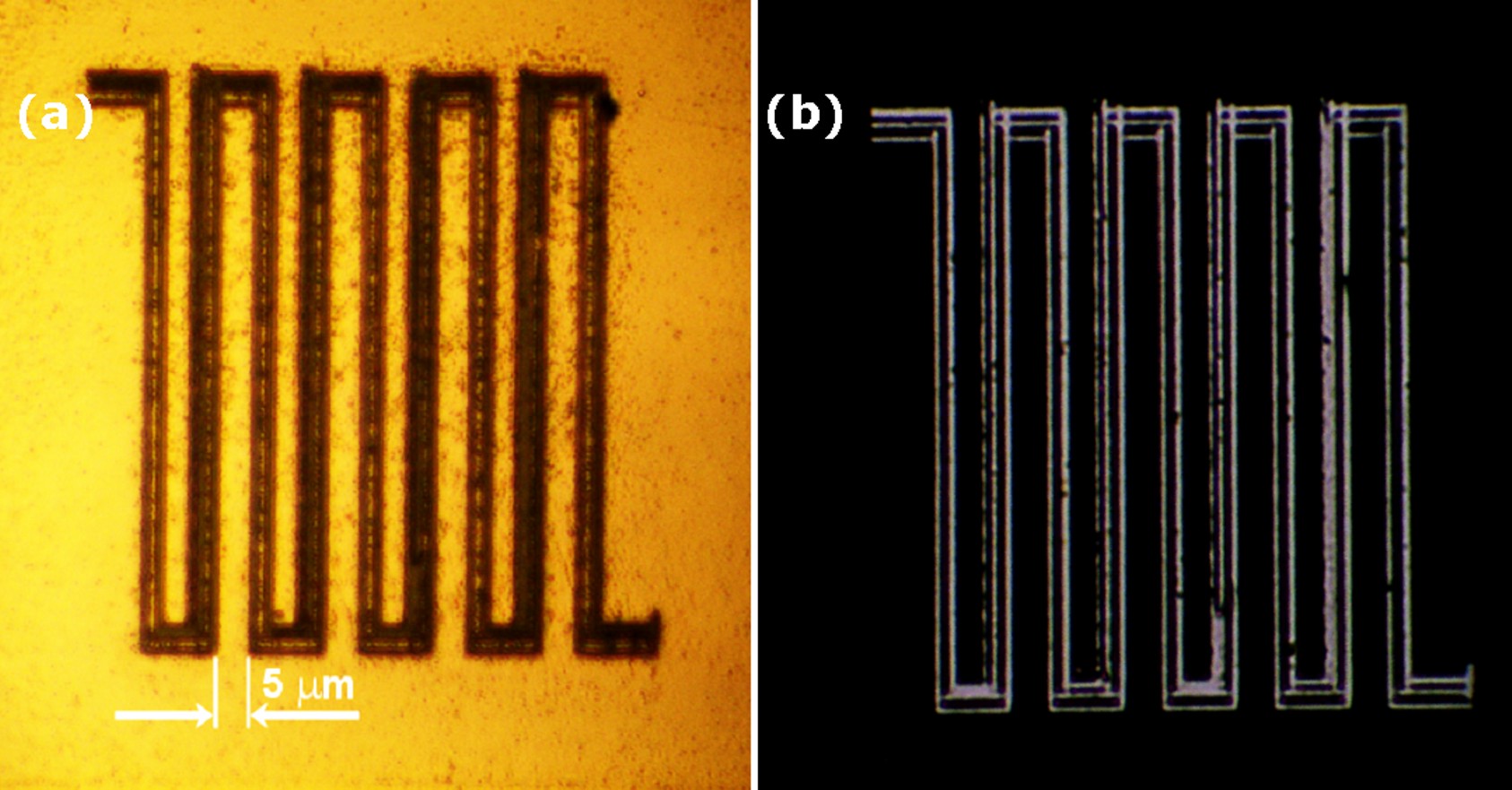 Teste de formare a digitilor prin treceri multiple pe film de aur depus pe substrat transparent de sticla. (a) Microscopie optica in reflexie. (b) Microscopie optica in transmisie. (dati click pe poza pentru versiunea mai mare)