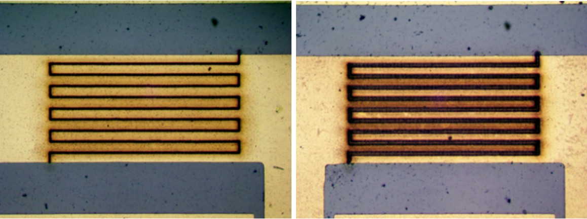 (a) Trecere simpla: latime digiti de 12 µm si spatiu interdigital de 3 µm; (b) Trecere dubla: latime digiti de 8 µm si spatiu interdigital de 7 µm (dati click pe poza pentru versiunea mai mare)