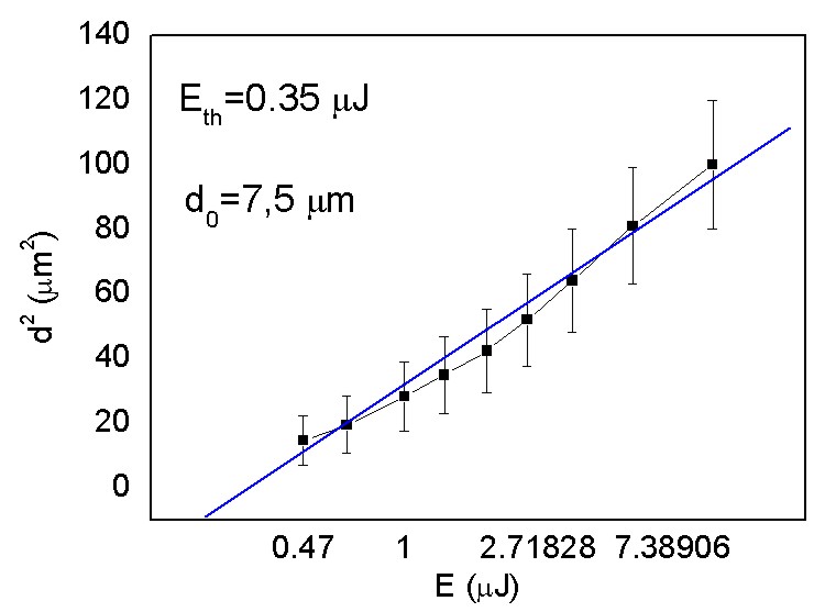 Dependenta diametrului craterului format prin ablatie in functie de fluenta laser pentru ablatia cu un singur puls laser