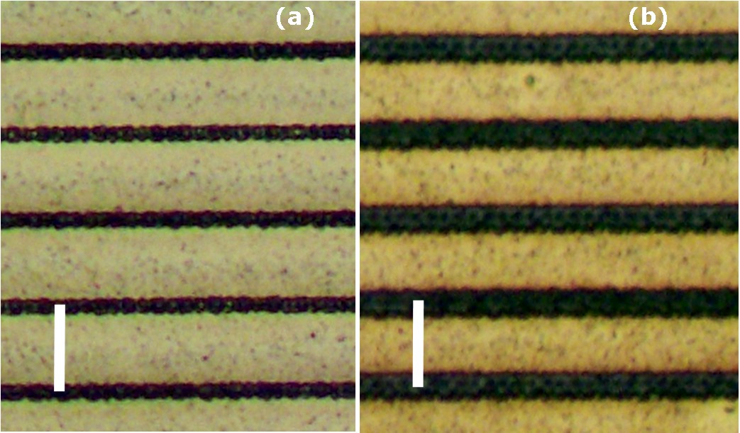 Structuri create cu laserul in filmul de aur: (a) latime de 2.5 µm pentru defocalizare Δz = 80 µm, si (b) latime de 5 µm pentru Δz = 40 µm. Energia laser a fost de 200 nJ/pulse. Scala este de 15 µm