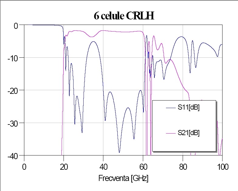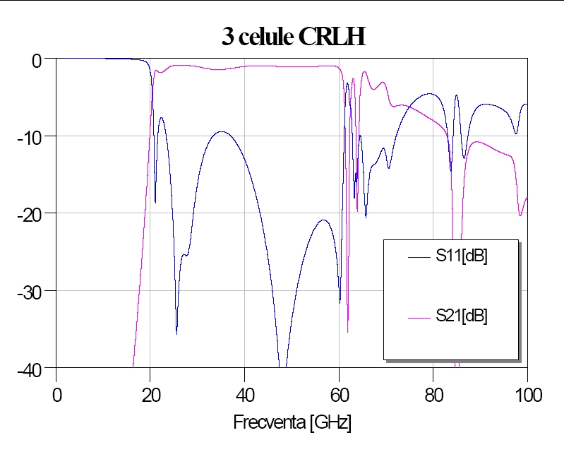 Parametrii S11 si S21 obtinuti in urma analizei unui circuit CRLH cu functie de filtru trece-banda pentru 2 (a), 3 (b) si 6 (c) structuri CRLH identice cascadate (simulare in IE3D)