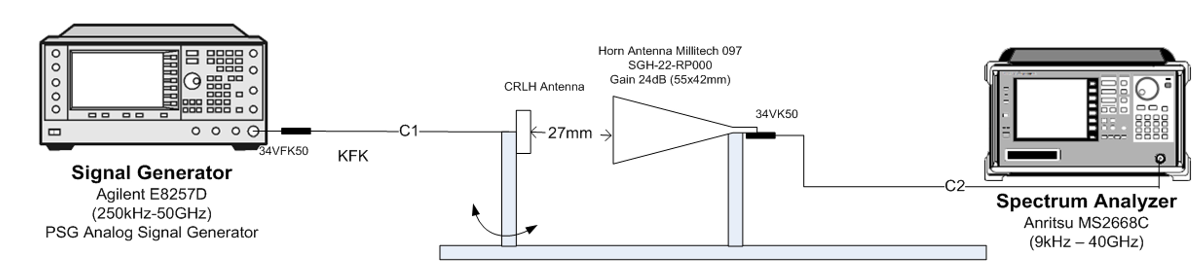 Montaj pentru masurarea directivitatii antenei CRLH in cazul in care emisia se efectueaza cu antena CRLH (click pentru imagine mai mare)