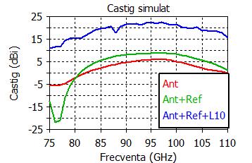 în Fig.1sunt prezentate rezultatele comparative ale simulării electromagnetice a antenei pe membrană de 94 GHz în trei cazuri: antenă, antena pe reflector şi antena pe reflector şi cu lentilă dielectrică de rază 10 mm şi grosime 15 mm, plasată la o distanţă de 3 mm de suprafaţa metalizată. O creşere a câştigului cu 15 dB este evidentă în aproape toată banda W (75 – 110 GHz).