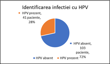 | In lotul de gravide studiat, a fost identificata infectia cu cel putin o tulpina de HPV la 41 de persoane (28%) |