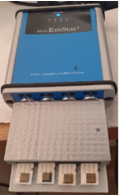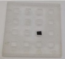 Astfel a fost creata o incinta de tip godeu, in care lama sa poata fi asezata si solutia de hibridizare impreuna cu probele sa fie adaugata deasupra, in cantitate suficienta, ulterior poate avea loc o agitare eficienta necesara unei hibridizari cat mai bune. Dimensiunile actuale ale lamei de siliciu folosita sunt: 3,5mm x 3,5mm, distanta la care a fost scrisa fiecare sonda fata de celelalte sonde fiind: 500µm. Pentru realizarea incintei a fost proiectata si realizata o matrita cu o imprimanta 3 D pentru a se obtine camere de hibridizare individuale pentru fiecare chip testat si evitarea contaminari probelor. |