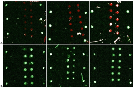 (A) Rezultatele hibridizării ADN monocatenar marcat fluorescent (Cy5 - roșu) obținut prin PCR asimetric. (B) Rezultatele hibridizării ADN monocatenar marcat fluorescent (Cy3 – verde) obținut prin digestie cu Lambda exonuclează. Coloanele marginale marcate cu verde reprezintă controlul pozitiv al imobilizării sondelor pe chip-ul de microarray. Controlul negativ al hibridizării nu prezintă semnal fluorescent. |