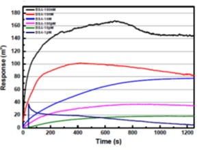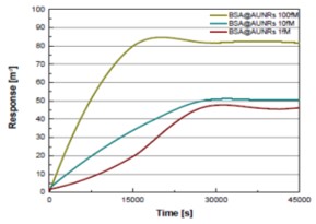 Pentru a evidenția rolul masei moleculare asupra limitei de detecție SPR, a fost utilizată fracția V a albuminei serice bovine (BSA), cu MW = 68 kDa. Rezultatele confirmă că limita de detecție poate fi scăzută utilizând molecule cu masă moleculară mare. Astfel, cea mai diluată probă detectabilă a avut concentrația de 10 pM, pentru ea înregistrându-se un răspuns maxim de ~150, după 20 min.