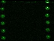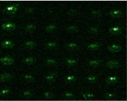 Coloanele din cele 2 margini (stanga dreapta) sunt controalele fluorescente imobilizate, iar in cele 4 coloane din mijloc se observa cum a hibridizat ADN-ul fluorescent monocatenar de lungime 217b provenit de la ampliconul de 217pb.