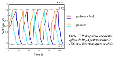 Importanta adaugarii monostraturilor de disulfurii de molibden (MoS2) in matricea polimerica poate fi observata in analiza comparativa a curbelor de incarcare-descarcare galvanostatica (GCD) inregistrate la curentul aplicat de 50 µA pentru structurile MSC cu si fara monolayere de MoS2.