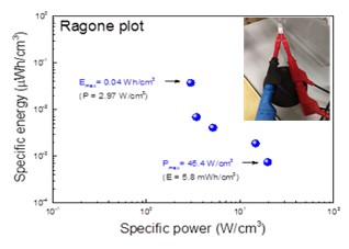 In ceea ce priveste densitatea de energie stocata, s-a obtinut un maxim de 1.7 µWh/cm2 (0.04 Wh/cm3). Densitatea maxima de putere a fost 0.9 mW/cm2 (45.4 W/cm3). Aceste performante situeaza micro-supercapacitorul obtinut in topul celor raportate pana in prezent in literatura de specialitate.